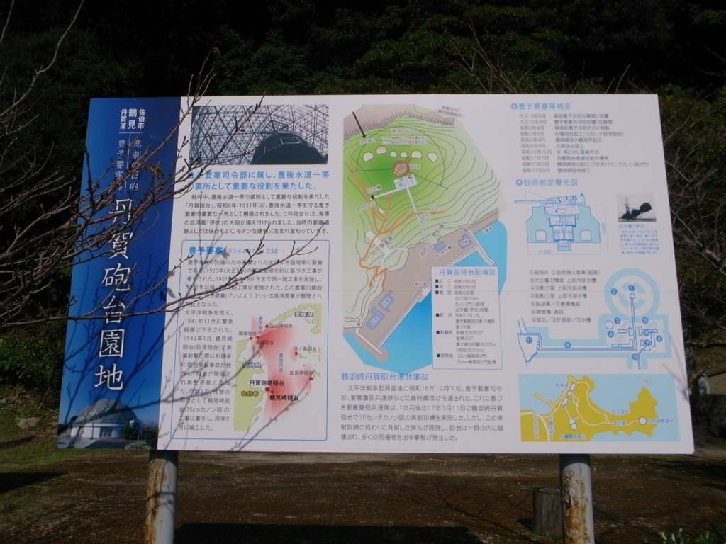 太平洋戦争を控え、1941年(昭和16年)11月に警急戦備が下令された。1942年(昭和17年)1月、丹賀砲台(砲塔砲台)で実弾射撃の際に右砲身の砲腔破裂事故が発生し、砲台が破壊され再生不能となった。同年3月、代替の砲台として鶴見崎砲台(15cmカノン砲)の工事に着手し、同年9月に竣工した。佐田岬砲台は榴弾砲を志布志湾の高崎砲台に移設したために1924年に一度廃止されたが、1925年2月より再整備工事が始まり終戦直前に工事が完了した。(wikipediaより)
