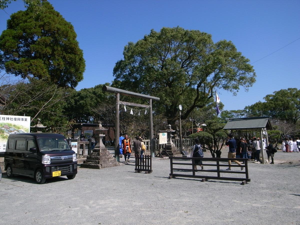 ぽかぽかしてきた気候の中、岡山公園を出て30分程・・・今度は柳川にあります「柳川護国神社」がある「三柱神社」を目指します。しかし神社に近づくにつれてちょっとした渋滞ががが。それもそのはず秋季大祭『おにぎえ』が開催中との事。