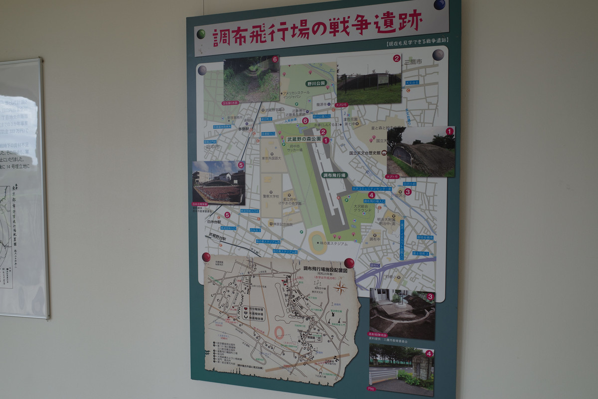 調布飛行場を挟んで、北地区と南地区に分かれており、人見街道(東京都道110号府中三鷹線)を挟んで200m北に、野川公園がある。