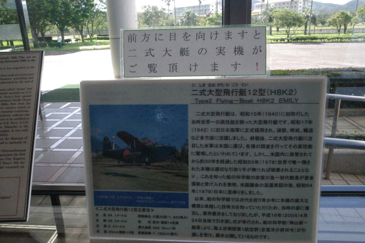 今回も割と時間ギリまで見学させていただきました。やっぱり特攻隊員の展示(撮影不可)では目から大量の汗が(TT 屋外展示に関しましては 暑いのと 前回拝見したのもありましたので二式大艇ちゃんだけ拝見することに。…硝子棚の紹介文がちょっと違う(=゚ω゚)