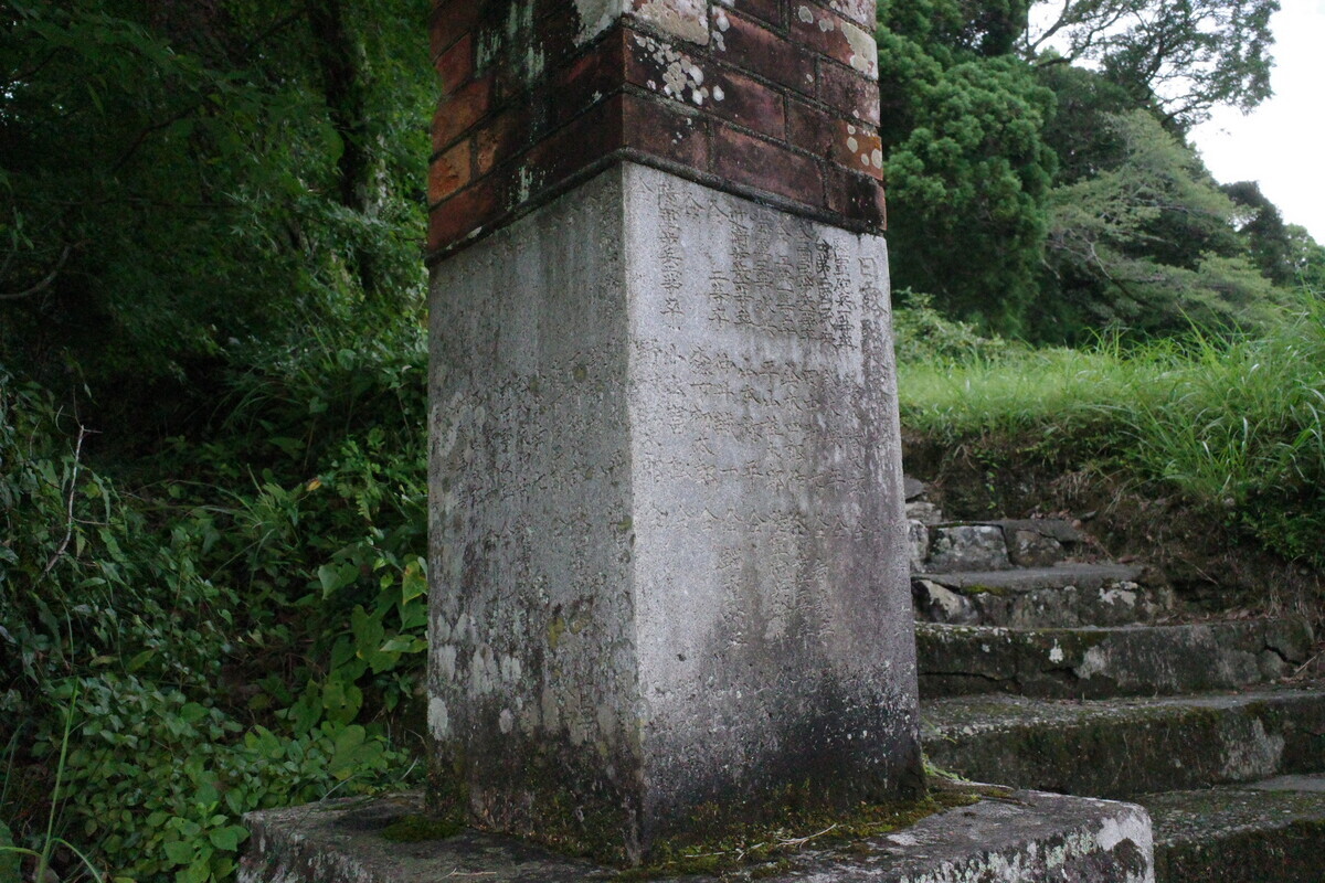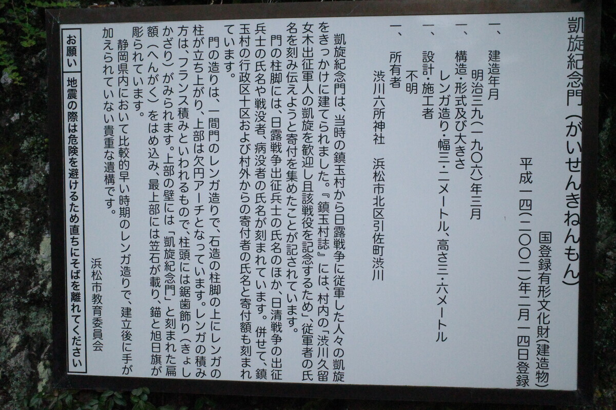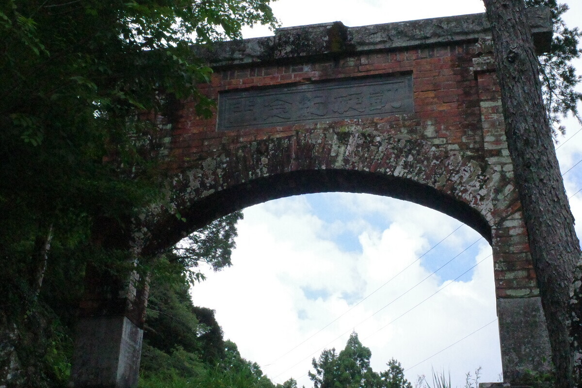 日露戦争を記念して,神社参道の途中に築かれた。石造柱脚の上に,柱頭を鋸歯飾とした煉瓦造柱が立ち上がり,煉瓦造欠円アーチを挟み込む。大型の扁額を嵌め込んだフランス積壁面の上部に,江戸切仕上石材の重厚な笠石を載せる。県内初期の煉瓦造構造物。(国指定文化財等データベースより)