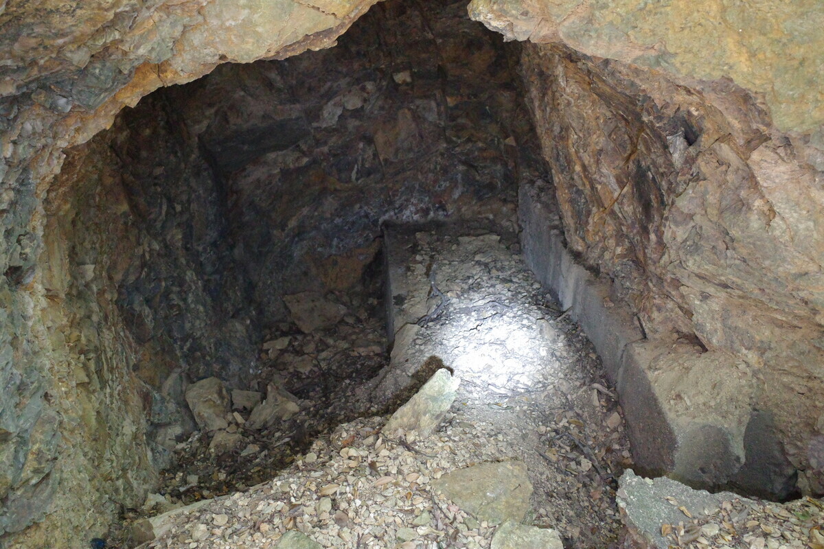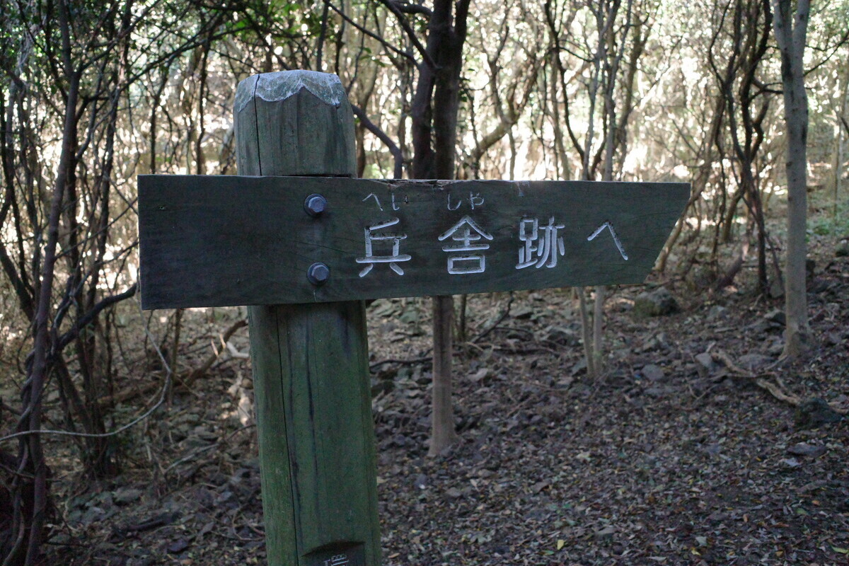 右に向かって「兵舎跡へ230m」とありますが手前の矢印は「まずは左のコースへ」と示してあるので素直に左へ。すぐに手彫りの壕らしきものがありましたが、奥は行き止まりでございましたので道なりに進みます。