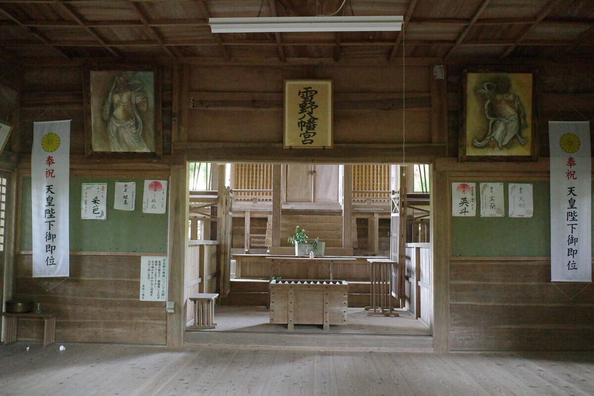 こじんまりとしながらも村の守り神と言った感じの素敵な神社「雪野八幡宮」へ到着。本殿に貼ってある命名の紙にほっこりしながらご挨拶します。目的地は…右手か。