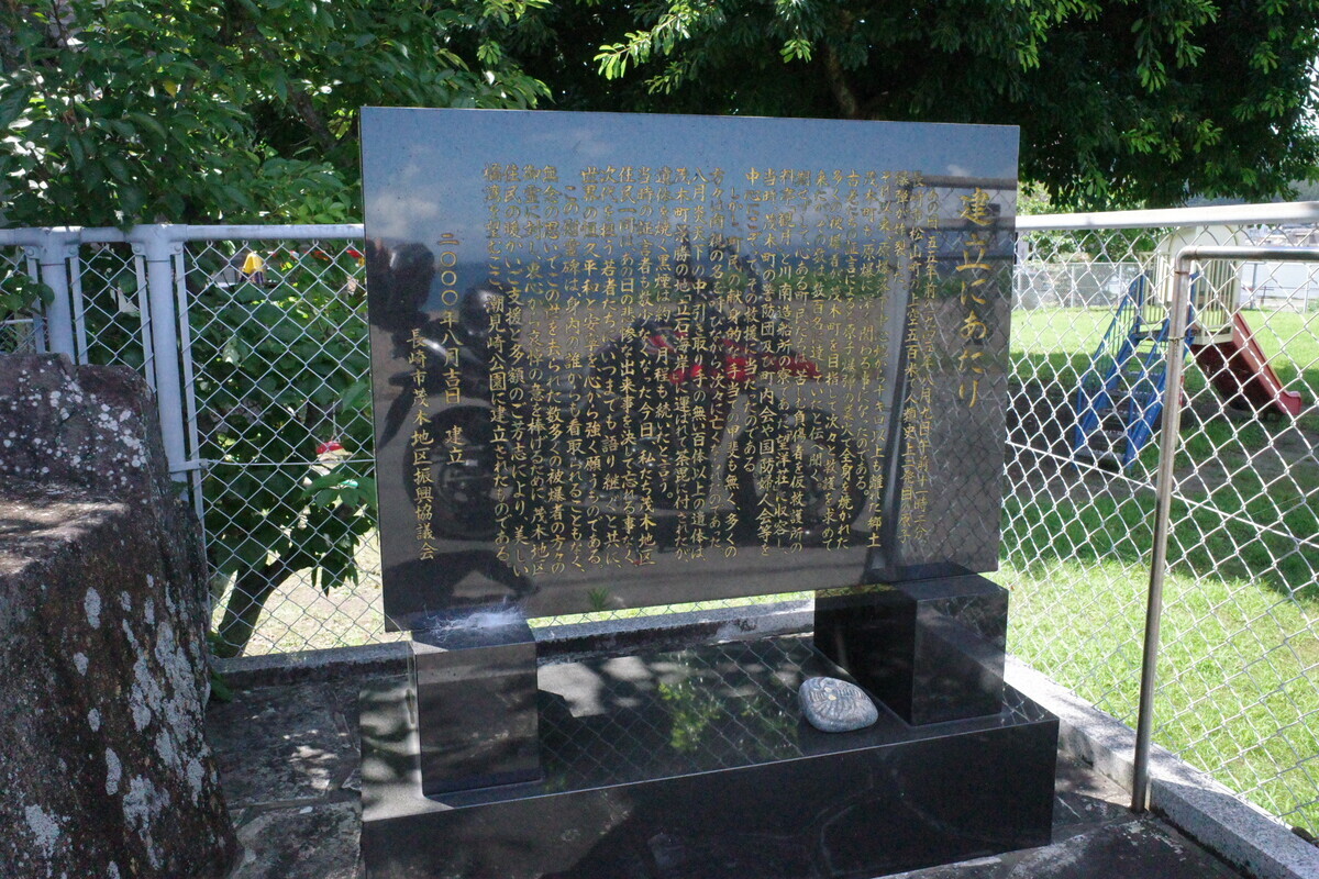 小さな港町の一角にありますこちらが「長崎市茂木地区原爆慰霊碑」です。花や水も綺麗に供えてらっしゃる慰霊碑に手を合わせ、どうか安らかにと祈りました。