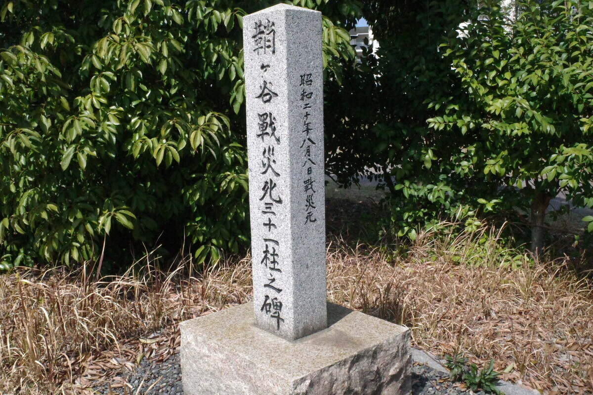 好天にて結構な人が詣でている「谷口霊園」。こちら中央の納骨堂正面にありますのが「戦災殉難者之碑」です。地域の戦災殉難者を祀った慰霊碑ですので、ご焼香して手を合わせどうぞ安らかにと祈りました。