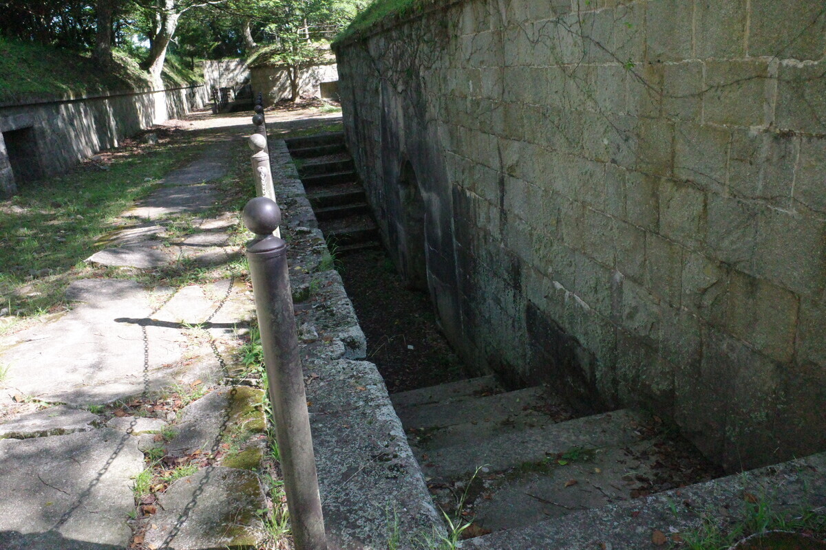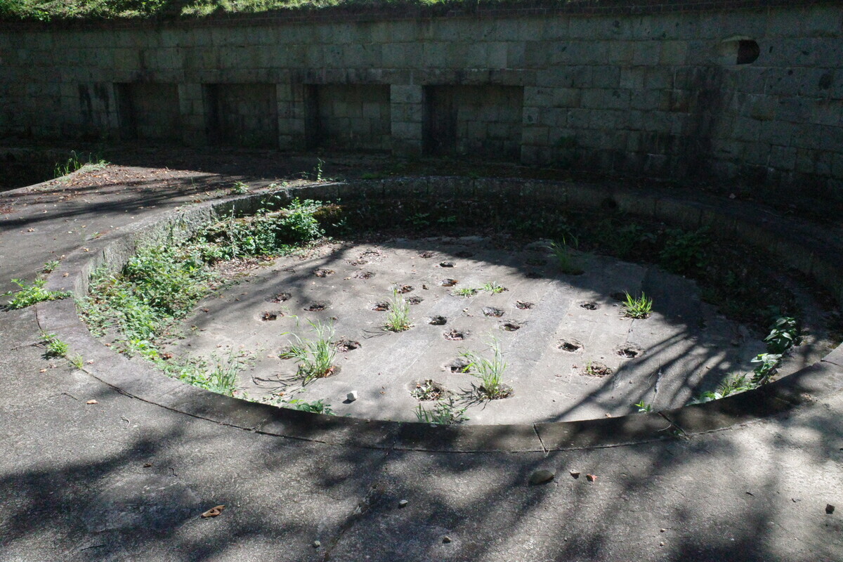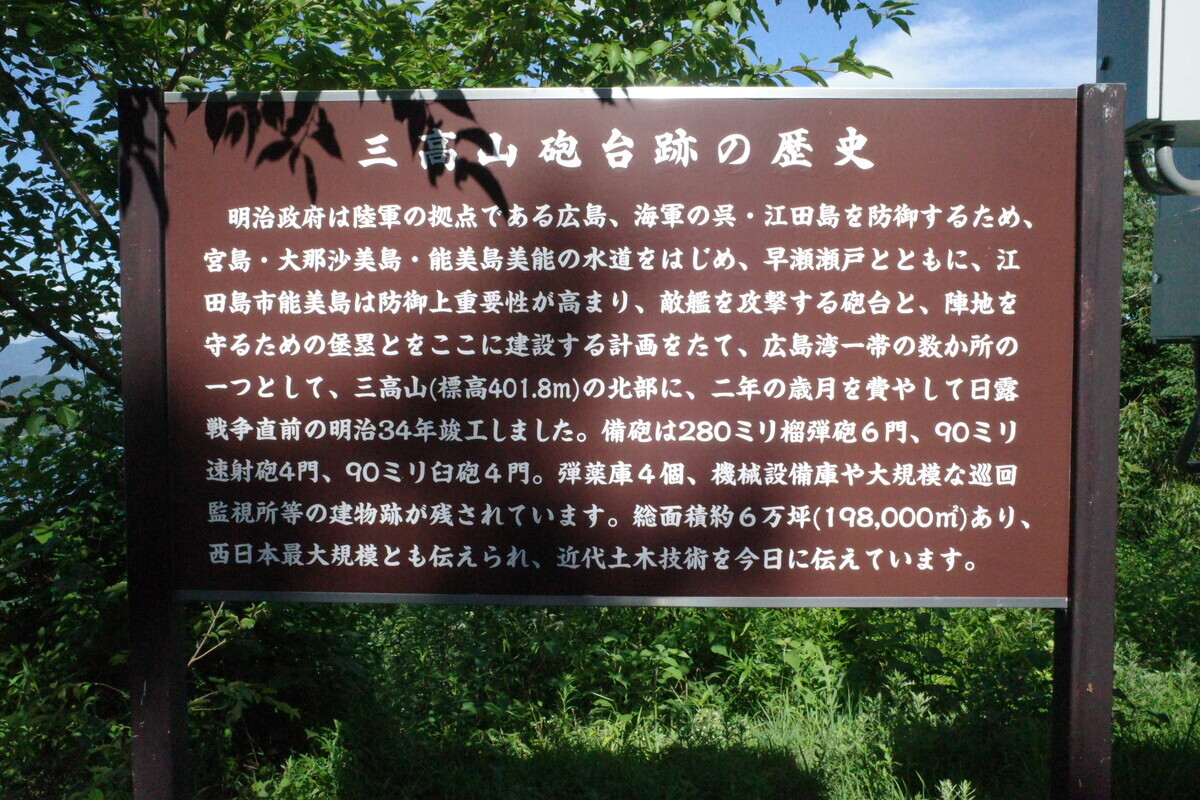 山頂付近には、旧陸軍が設置した砲台の史跡があります。北部砲台と南部砲台に分かれています。この二つを合わせて三高山堡塁跡と言います。砲台山の山頂は南部砲台をさらに尾根沿いに南に向かった遊歩道、東屋の隣に三角点が設置されています。(江田島市観光HPより)