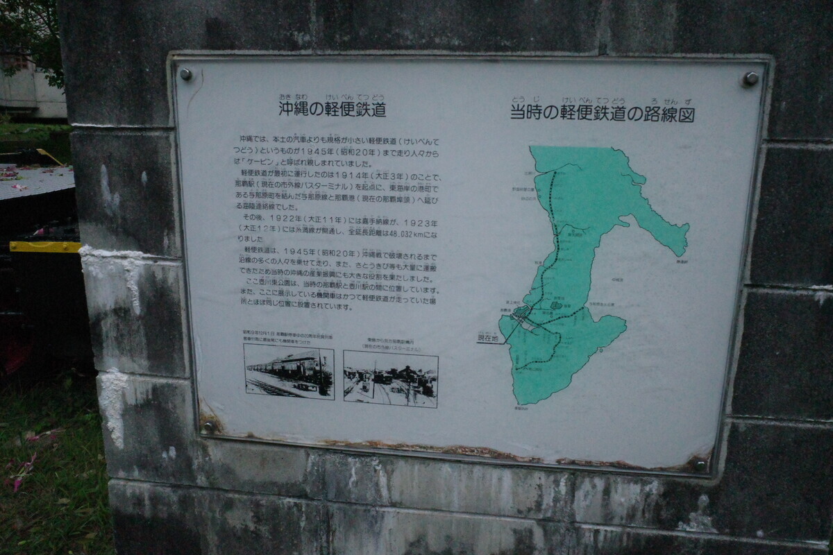 ここ「壷川東公園」にありますのが、戦前から戦中にかけて使われていた沖縄県営鉄道の展示でございます。置いてある「シュガートレイン」は南大東島で使われていたもので、軽便鉄道のものでは無いのですがレールは当時のものとの事。沖縄にもこんな歴史があったのですねぇ。