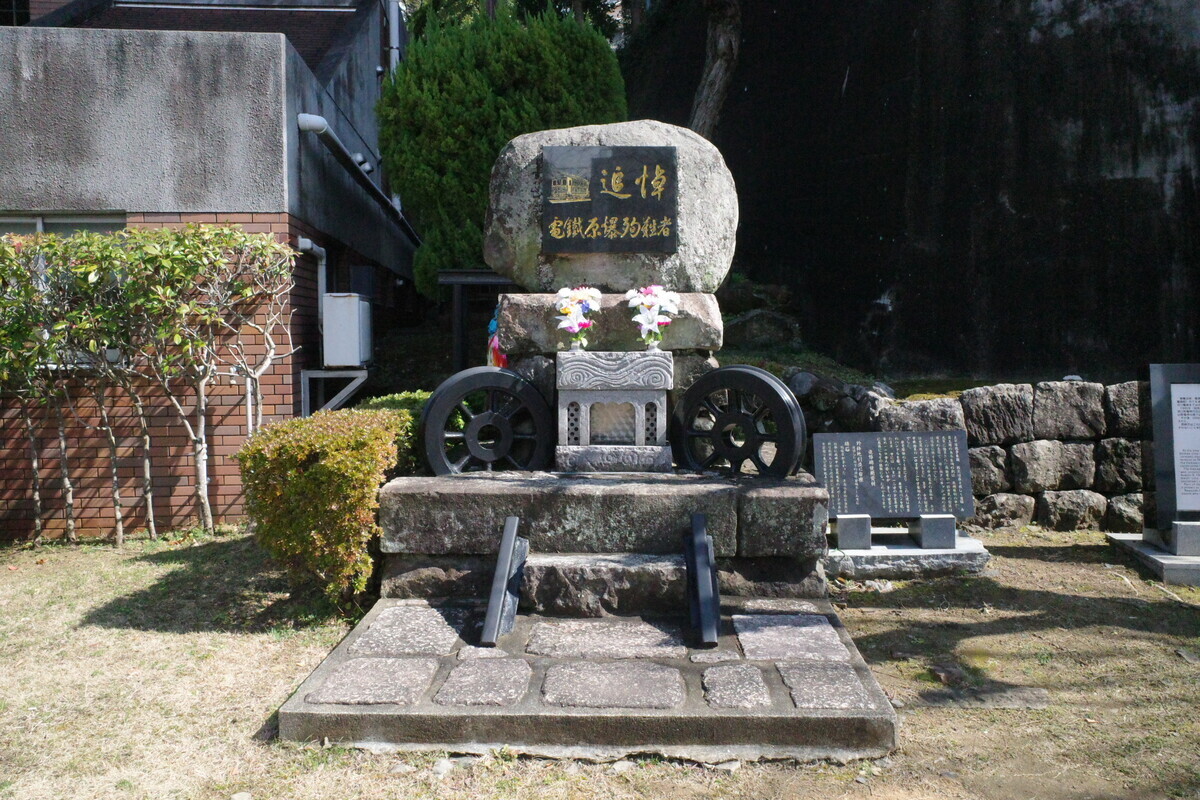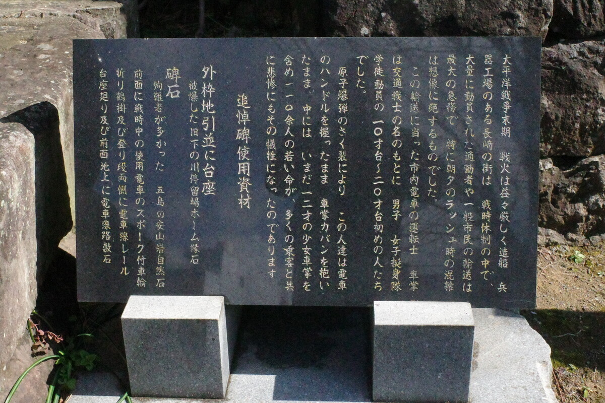 原子爆弾のさく裂により この人達は電車のハンドルを握ったまま 車掌カバンを抱いたまま 中にはいまだ十二才の少女車掌を含め一一〇余人の若い命が、多くの乗客と共に悲惨にもその犠牲になったのであります(碑文より)