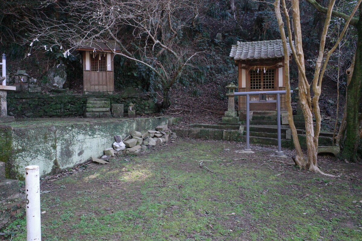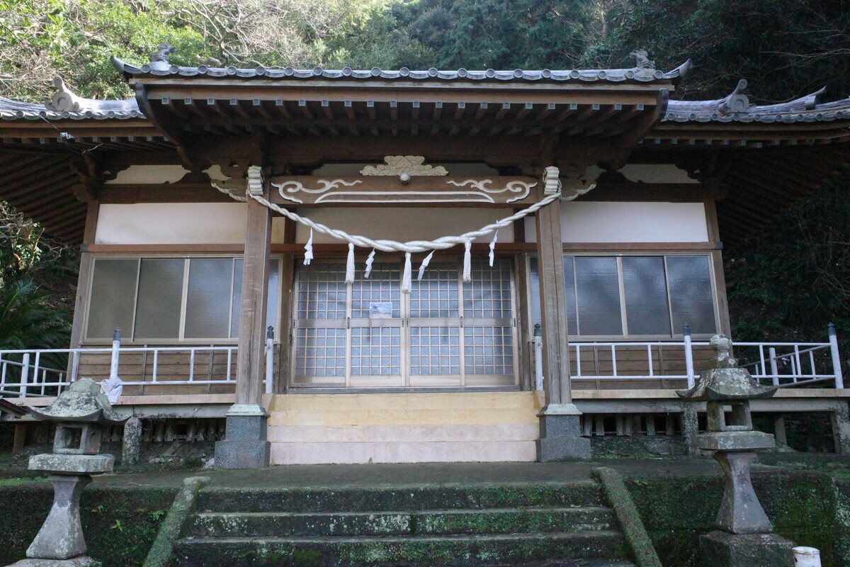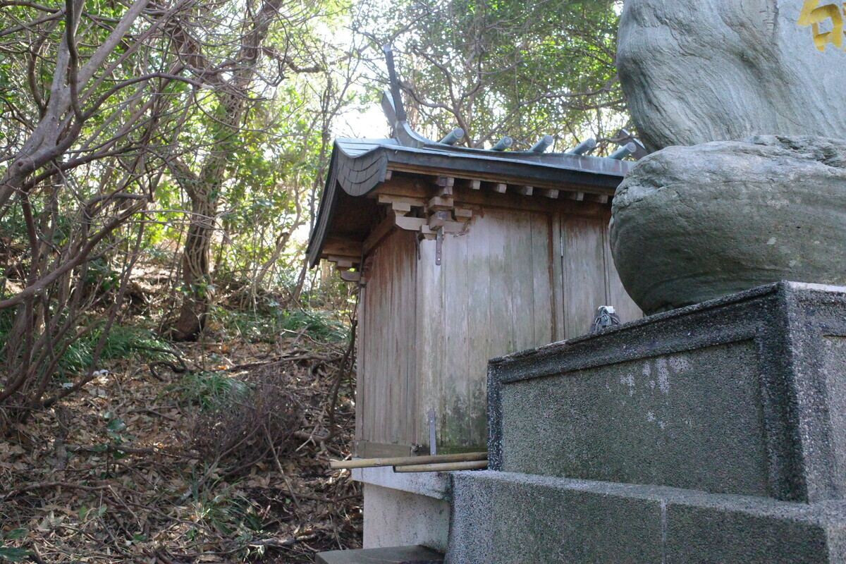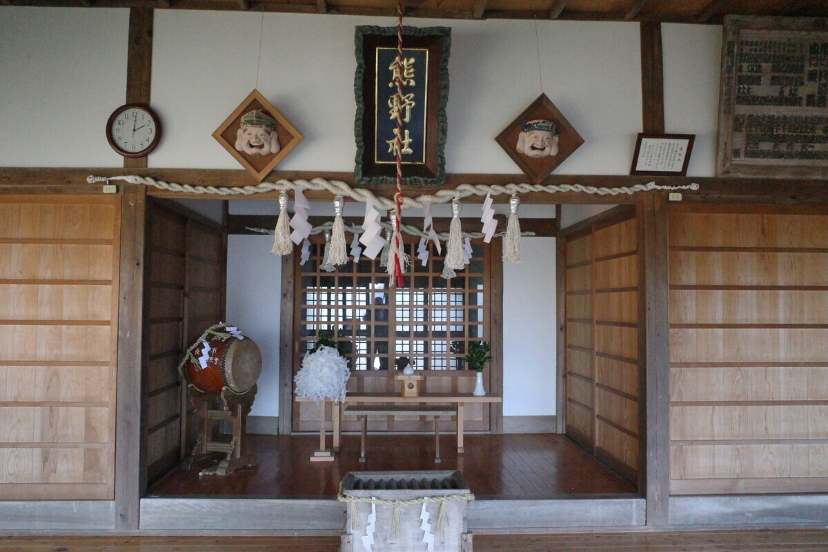 というわけで「樺島熊野神社」へ到着。何はともあれ本殿へご挨拶…なんかパゥア系のつっかえ棒が印象的ですが、とりま手を合わせます。